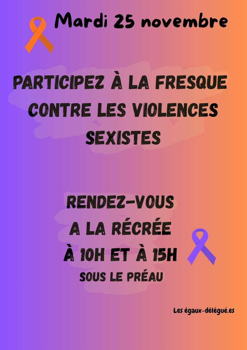 les égaux-délégué.es (élèves élu.es au CVL, Dispositif Phare et Eco-délegué.es) ainsi que les référentes Égalité vous invitent à participer à une fresque pour dire "Stop aux violences sexistes et sexuelles" lors des 2 temps de récréation, sous le préau.